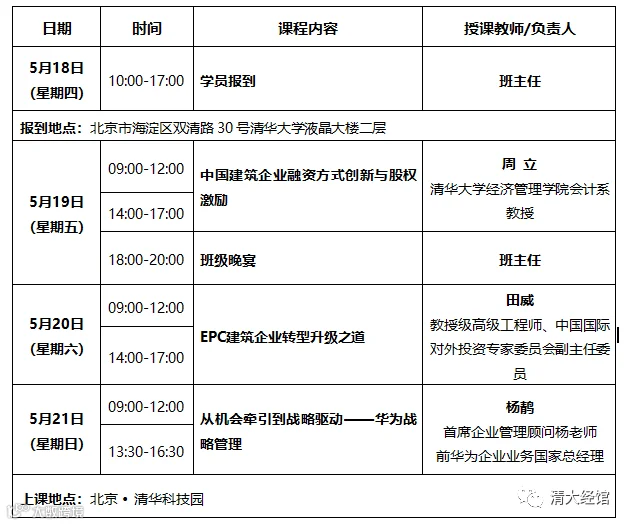 欢迎参加《清大高级工商管理(建筑业)总裁研修班》,本次课程将于2023年5月19日(周五)9:00在北京准时开课。请您提前安排好时间,课程具体安排如下: