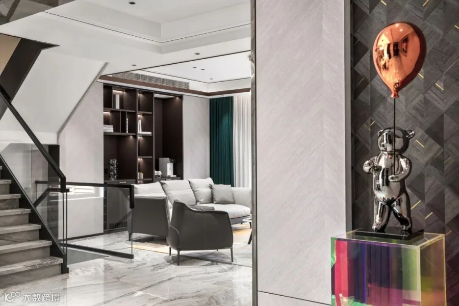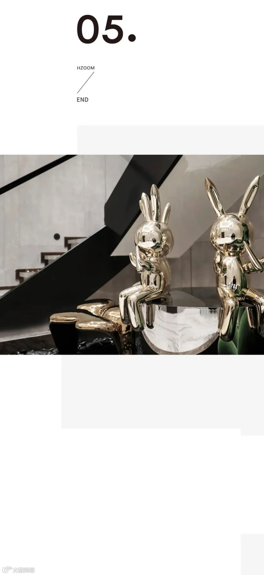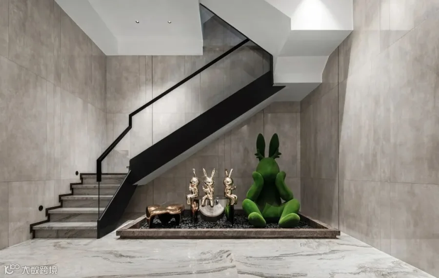 楼梯处,恍若误入爱丽丝的小天地。托腮思考的植绒兔子席地而坐,而三只金属小兔以独特的质感散发熠熠光彩,前卫冷冽的材质与圆润童趣的造型相碰撞,以刚化柔,趣味横生,并与大理石铺陈的楼梯形成色彩、肌理的强烈反差,仿佛在破次元的空间中自由徜徉,述说着天马行空的幽默。