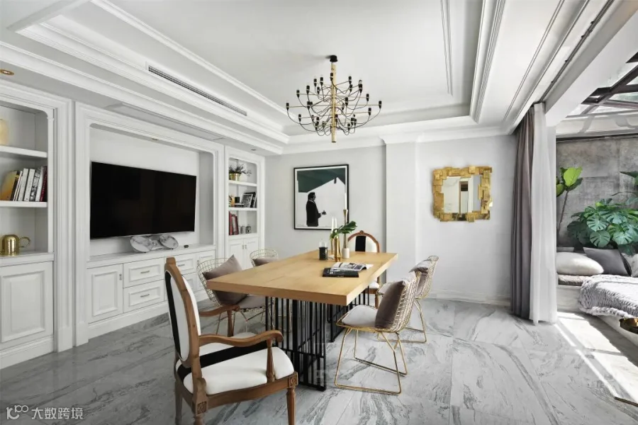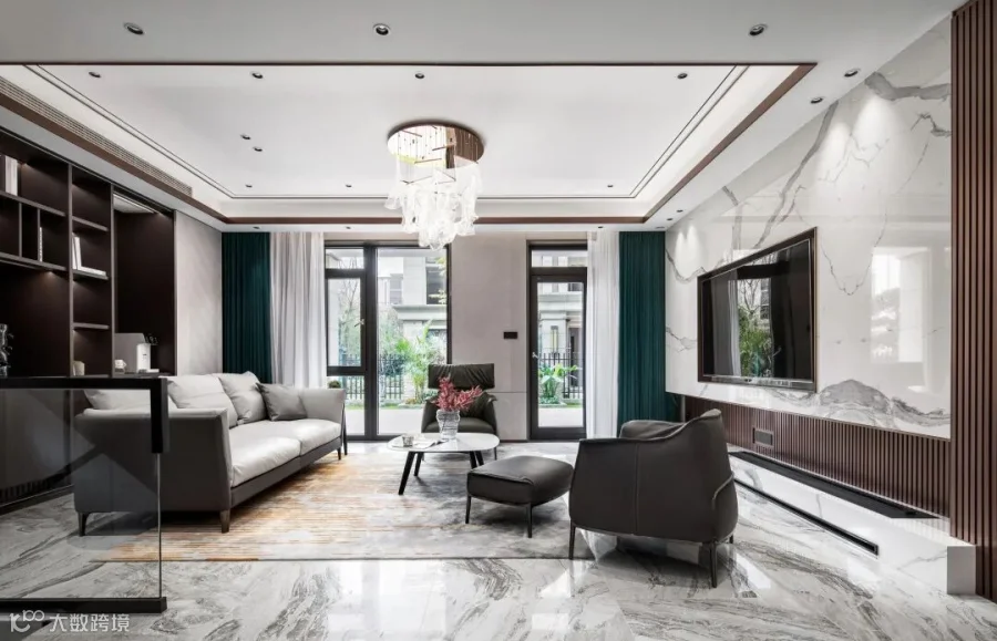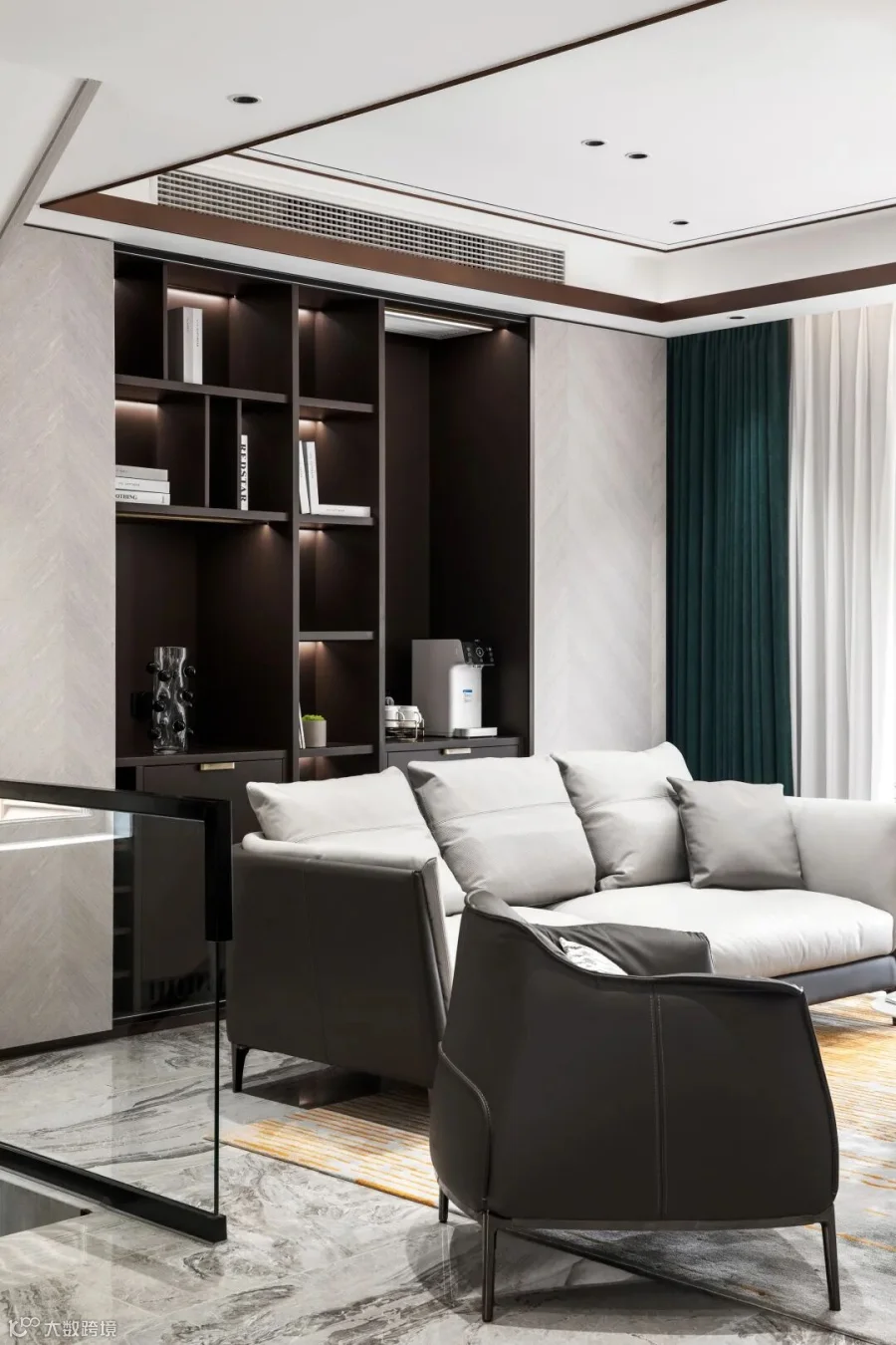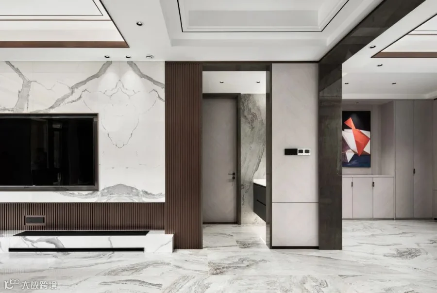 电视机背景墙由白色大理石铺展,璞玉般温润的肌理细细描绘着山水墨纹,不需要人工加以修饰,还原纯粹本真。背景墙以格栅之形勾勒,疏而不透,其棕色纹理与对面的墙柜相衬,同皮质软装的碰撞中提升了精致的生活格调。