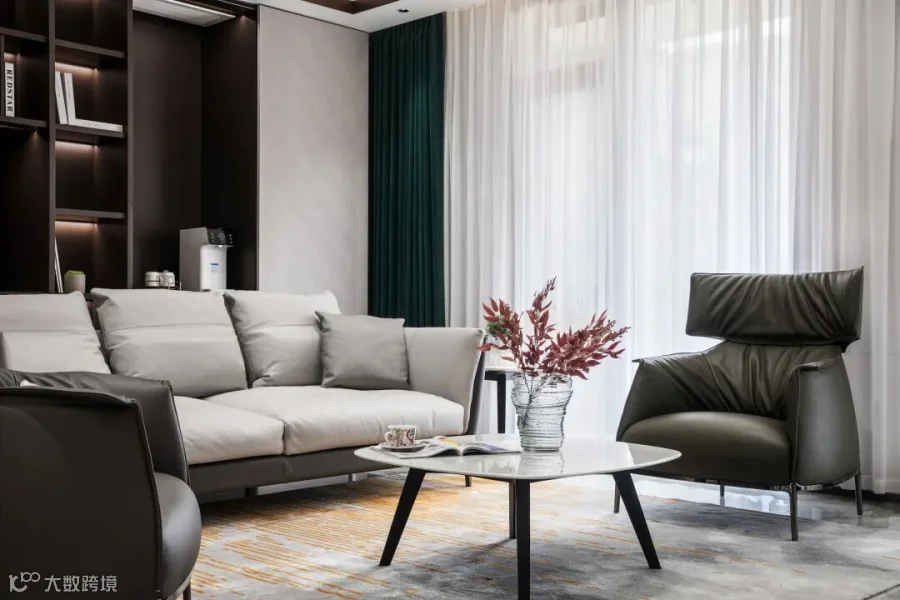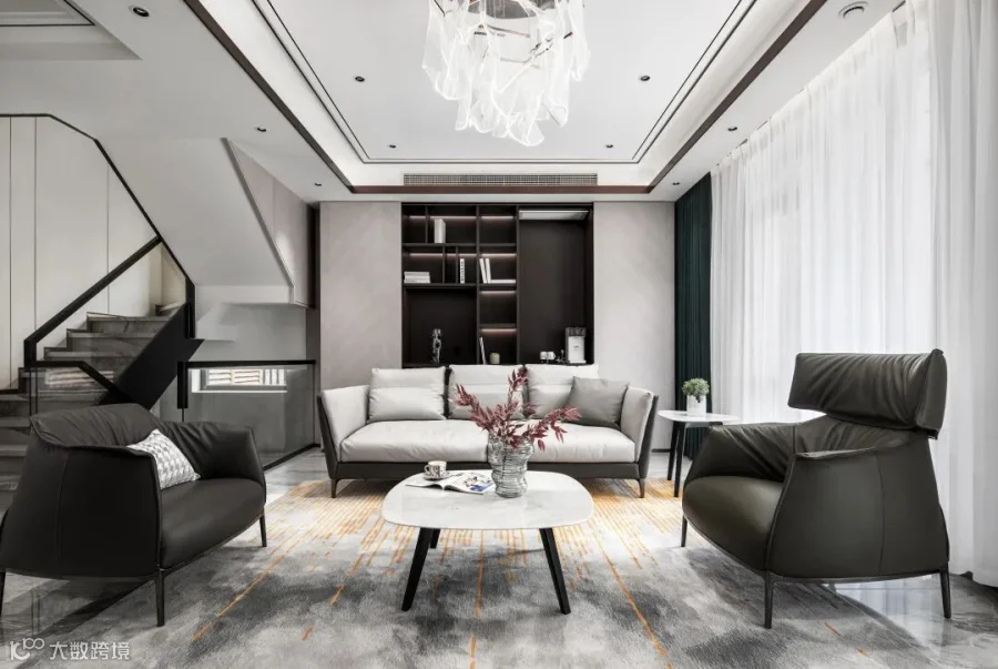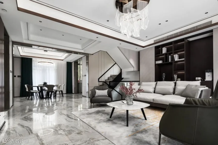 转入客厅,低调雅致的基底以白、棕为主色调,或浅或深,由明入暗,搭配皮质沙发的质感肌理构建出立体的层次感。薄似轻纱的吊灯飘逸垂落,在通透的灯光渲染中,似萤翼蝶骨,轻盈了客厅的厚重质感,回归轻松与遐意。