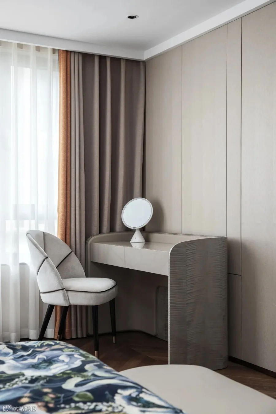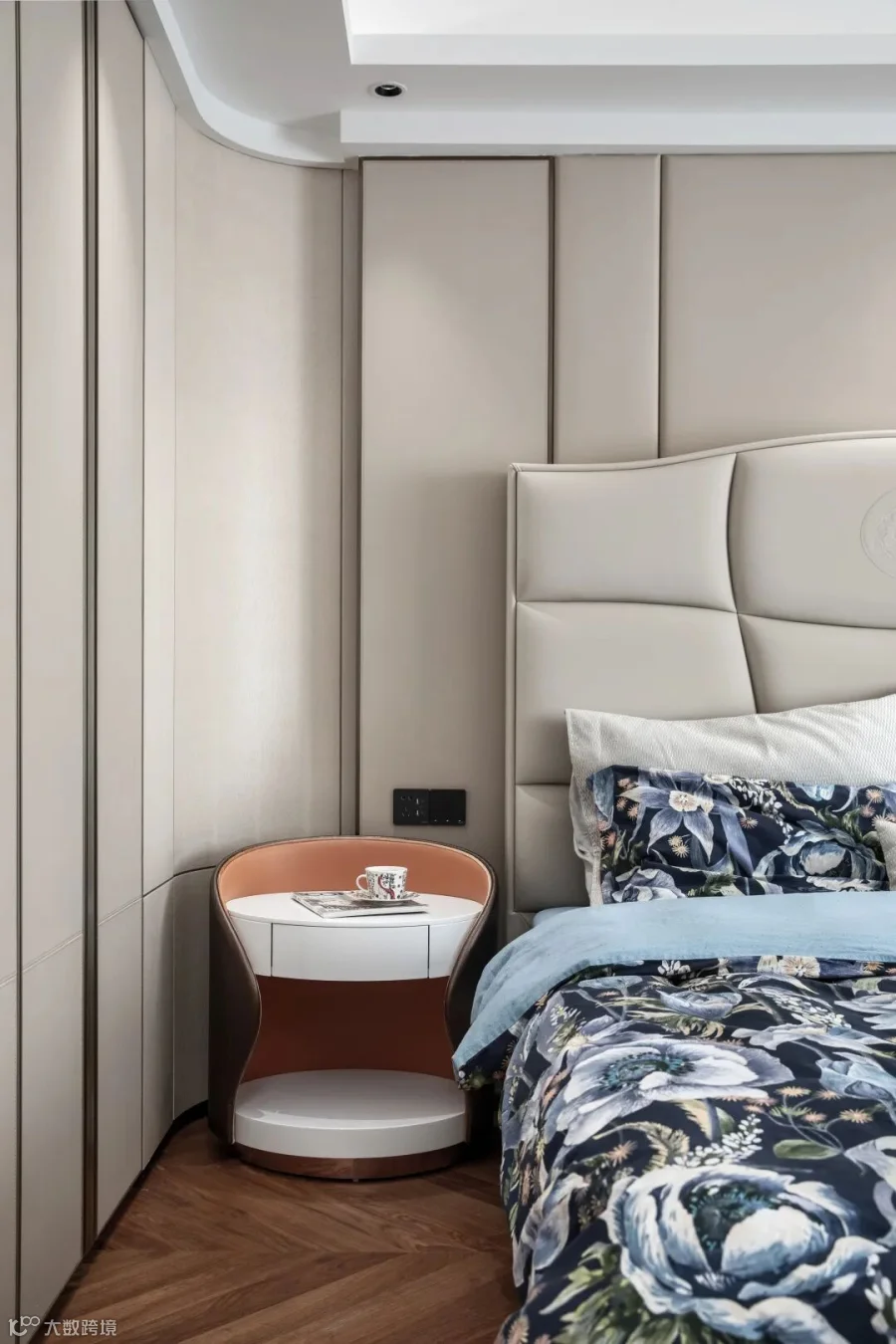 主卧延续了优雅质感的主体风格,米色木饰面铺陈整个墙面,床头以舒适的弧形构成过渡,为睡眠提供安心的包裹感。床品采用浓烈的图案色彩,摆脱素雅沉闷,唤醒一天的活力。