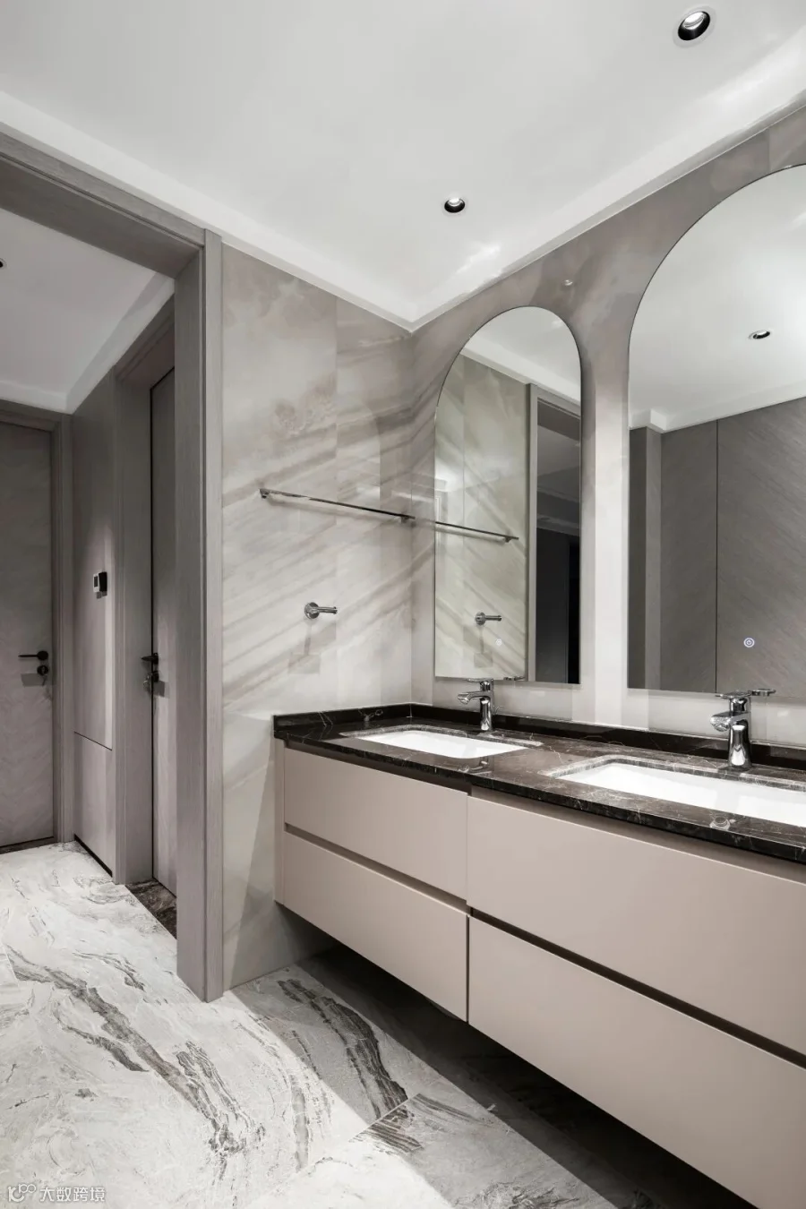 本案卫生间选用REX汉妮玉深啡,如天空云彩般变幻的纹理,为空间增添了灵动与柔美、诗意与浪漫的色彩,自然的美感融合天然玉石逷透温润的质感,也让空间变得温馨而奢华。