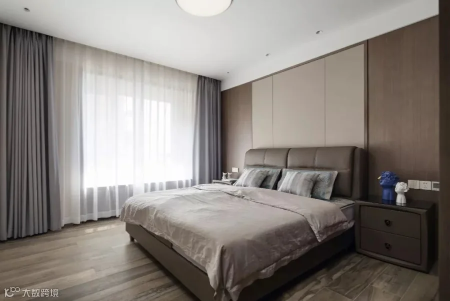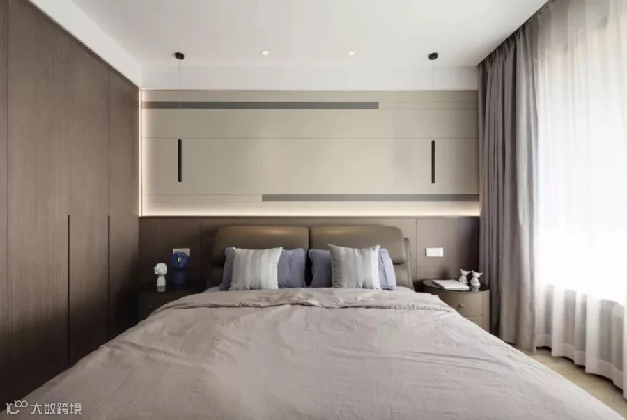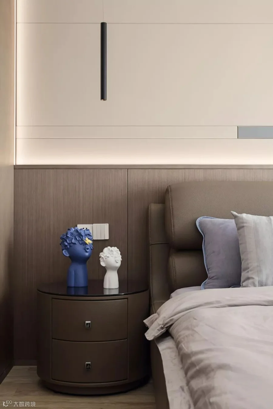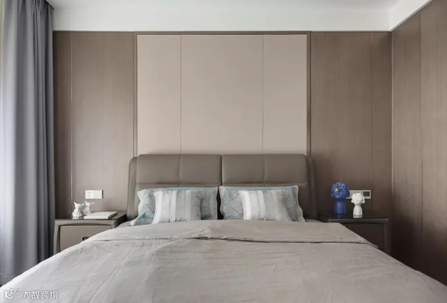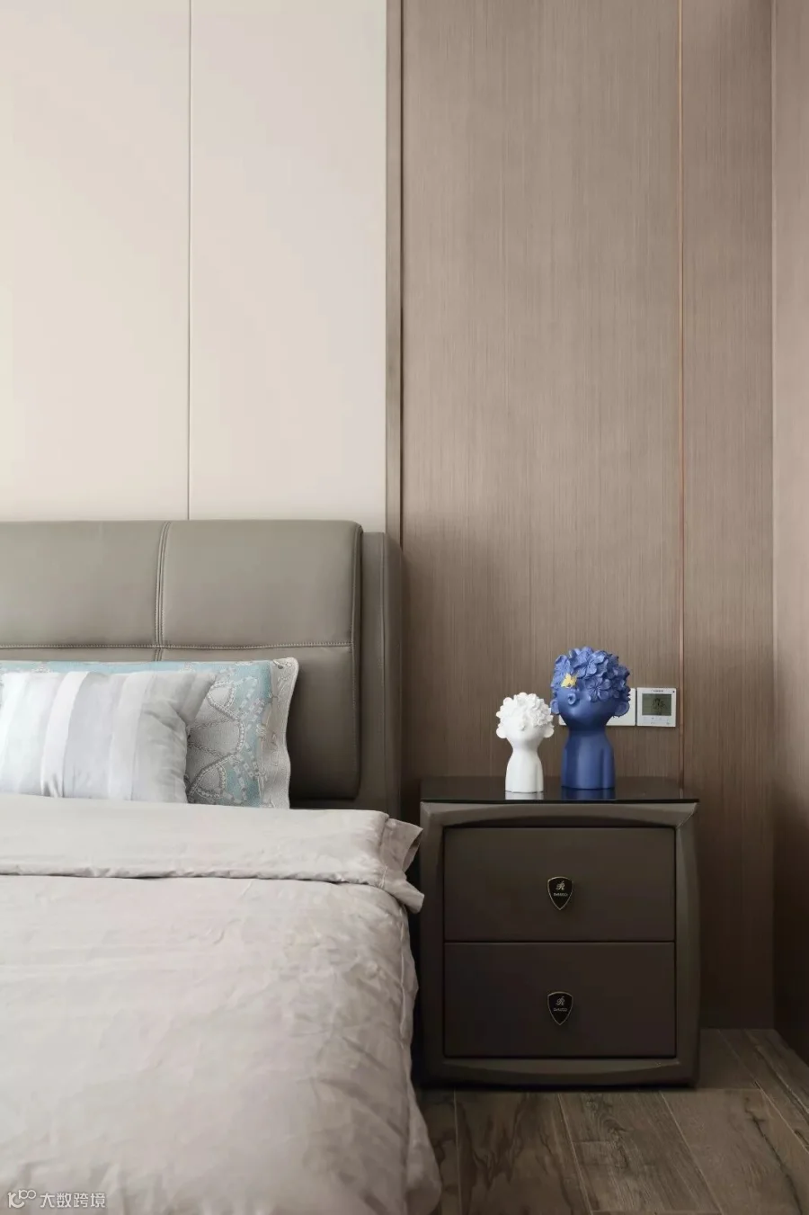 两个卧室的色调,都是低饱和度的色彩为主调的,在灰色、卡其色、米色、以及原木色彩的搭配中,空间带着一份洗净万千铅华的沉静洗练与优雅时尚。床头选择同色系的靠背,将房间内的感官氛围加以强化。