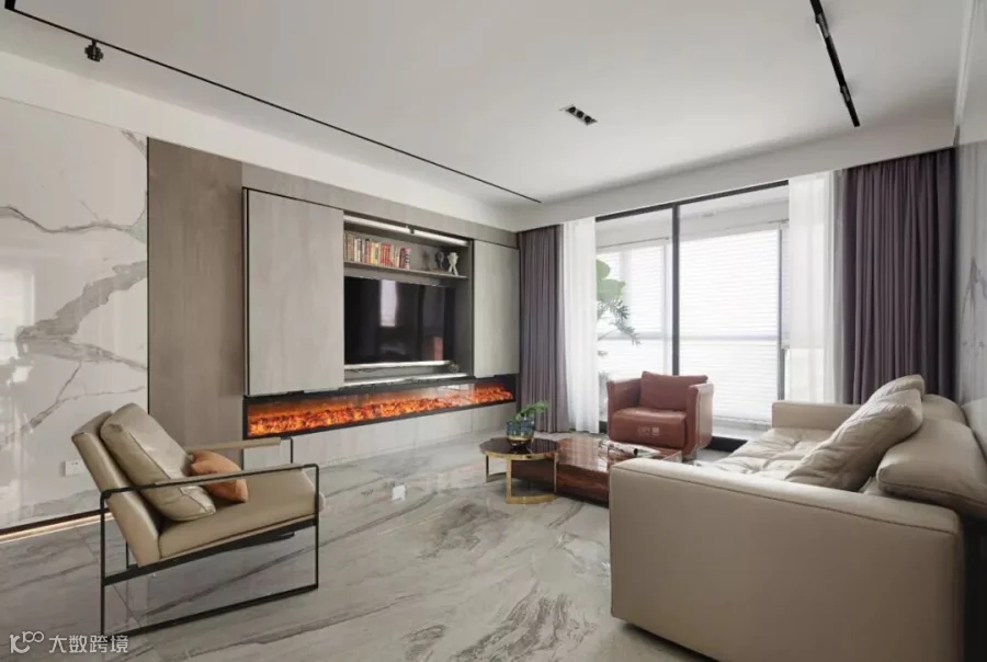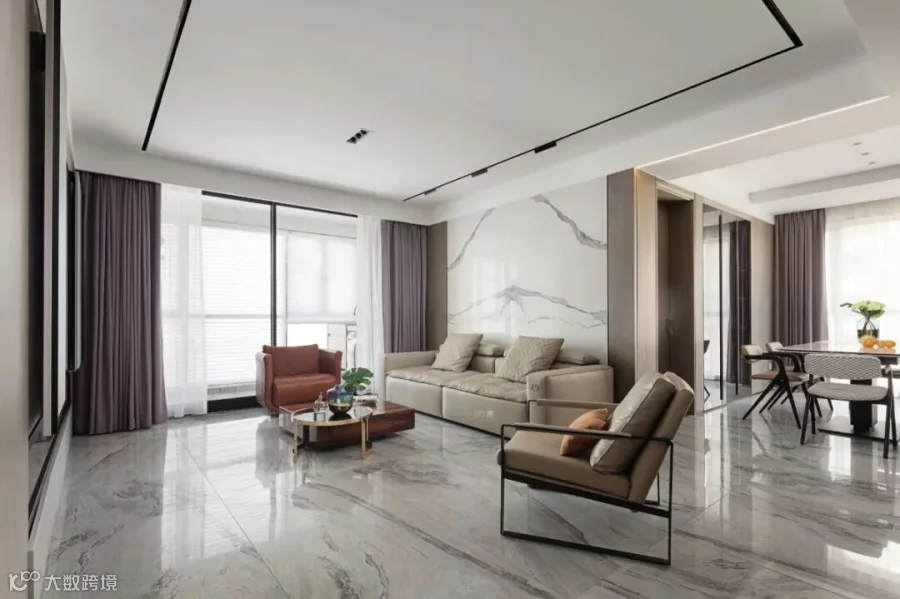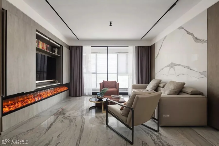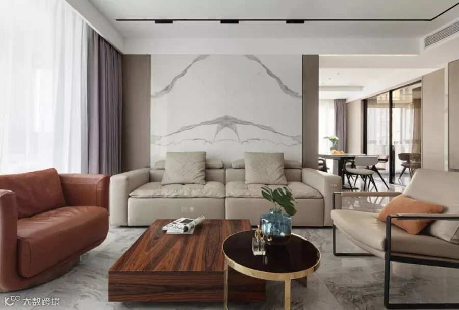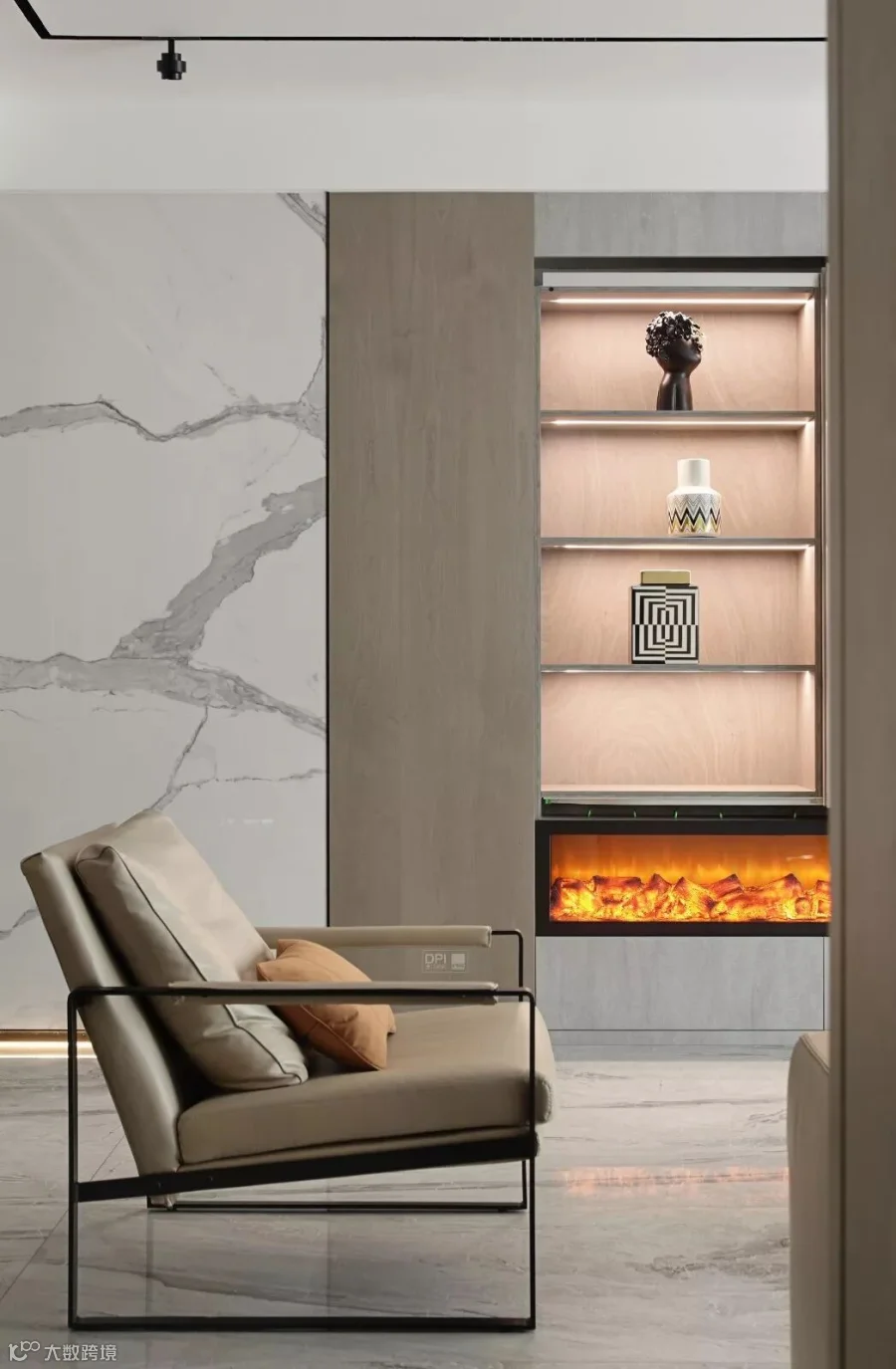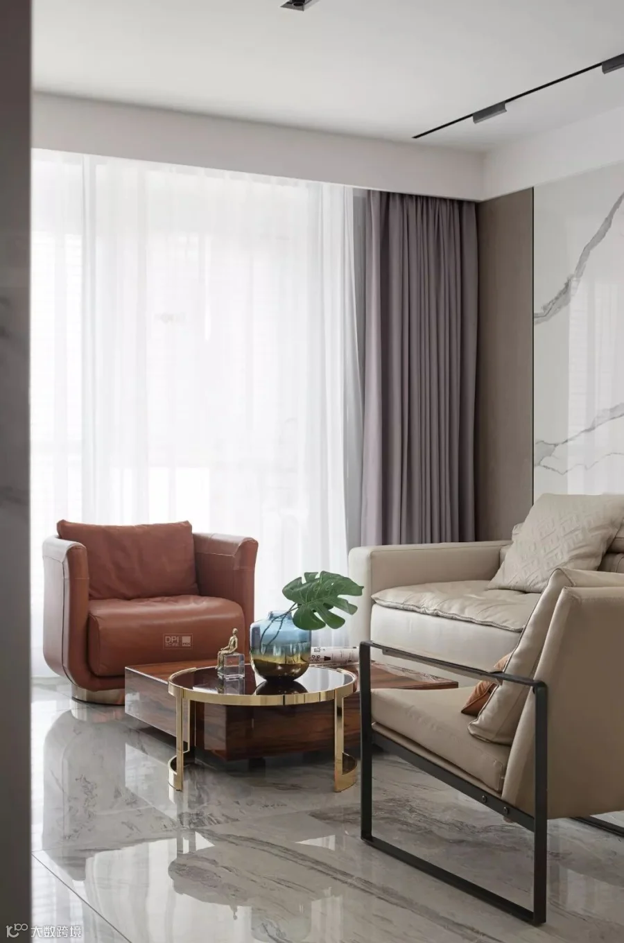 对于客厅的设计,设计师以内敛的色调,简洁的材质,塑造出静谧安定的空间氛围。通过对金属、布艺、皮革、原木、大理石、棉麻等材质的混搭下,碰撞出材质独有的韵味,为空间添加了看不见的层次感,空间在材质粒子的发酵下,使得这个空间精致而不张扬、干练而又简约。