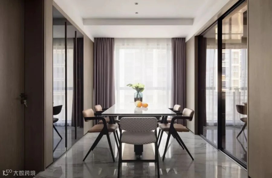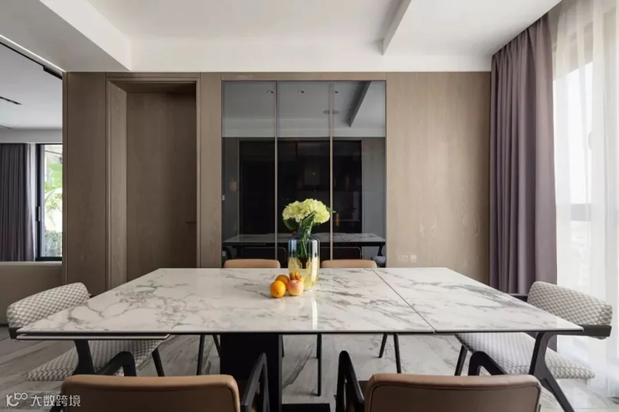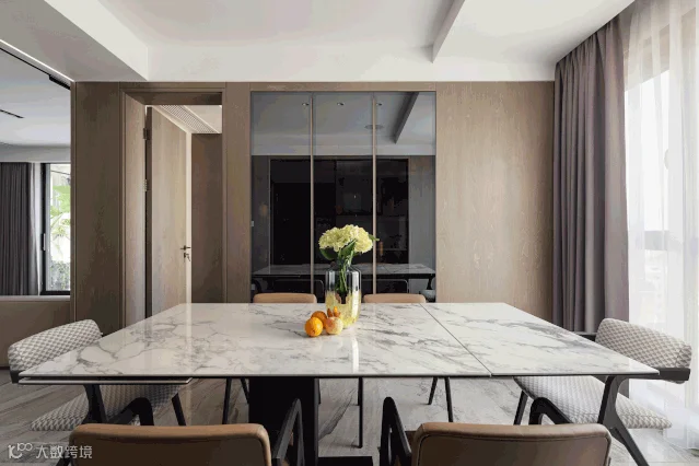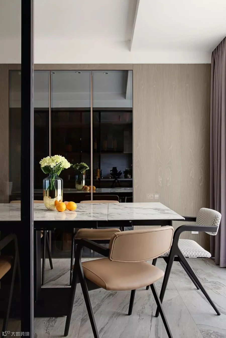 进入餐厅这个区域一张轻奢中带着优雅的大理石餐桌成为这里的焦点,在简洁时尚的外观下,将大理石与座椅中黑色不锈钢的完美结合下,打造出餐桌的高级质感。在诗意(鲜花)和生活(橘子)的点缀下,柔和的绒布质感下的餐椅,与空间合作氤氲出雅致、低奢、温馨的进餐氛围。
