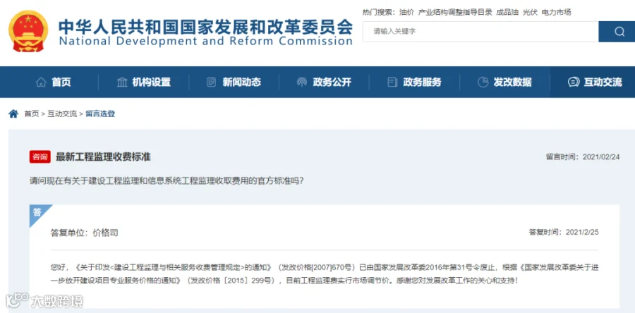 此前,有网友在国家发改委咨询《最新工程监理收费标准》。