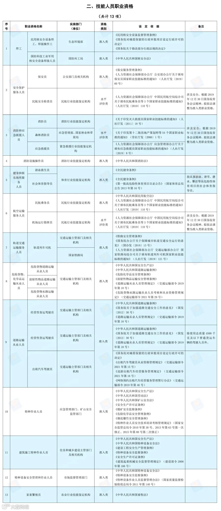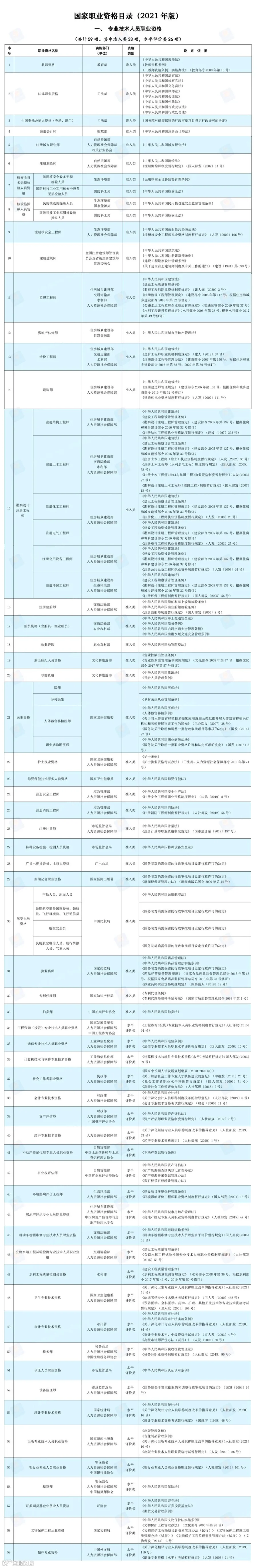 2021年版国家职业资格目录共计72项职业资格。其中,专业技术人员职业资格59项;技能人员职业资格13项。