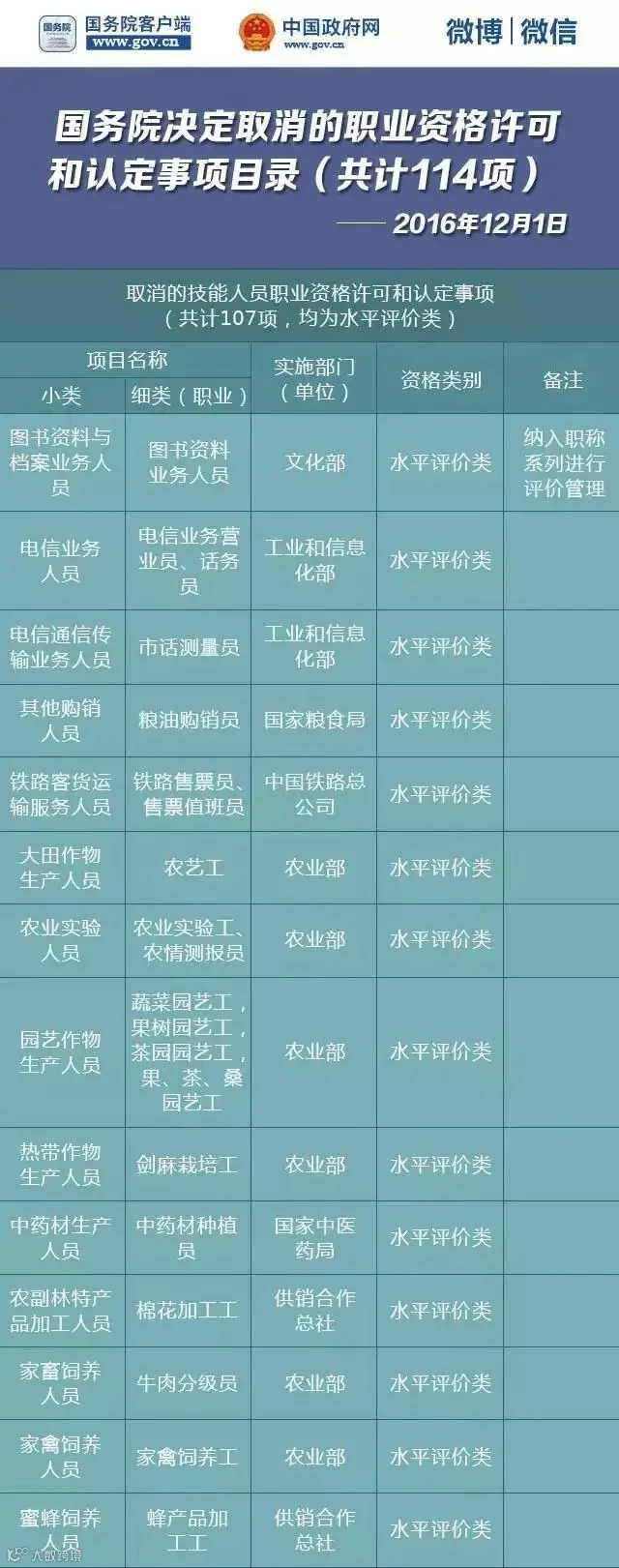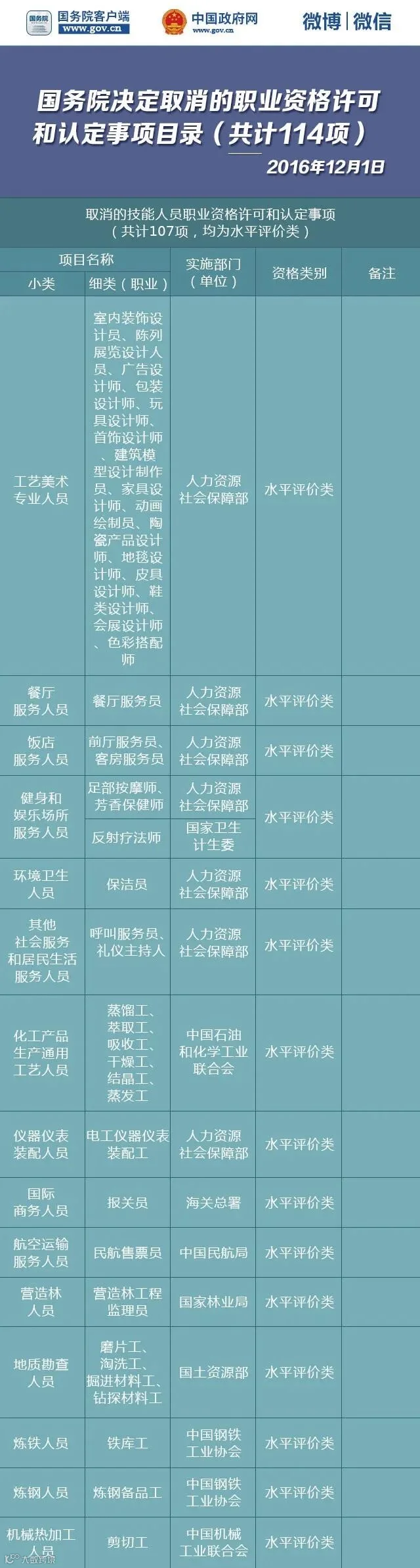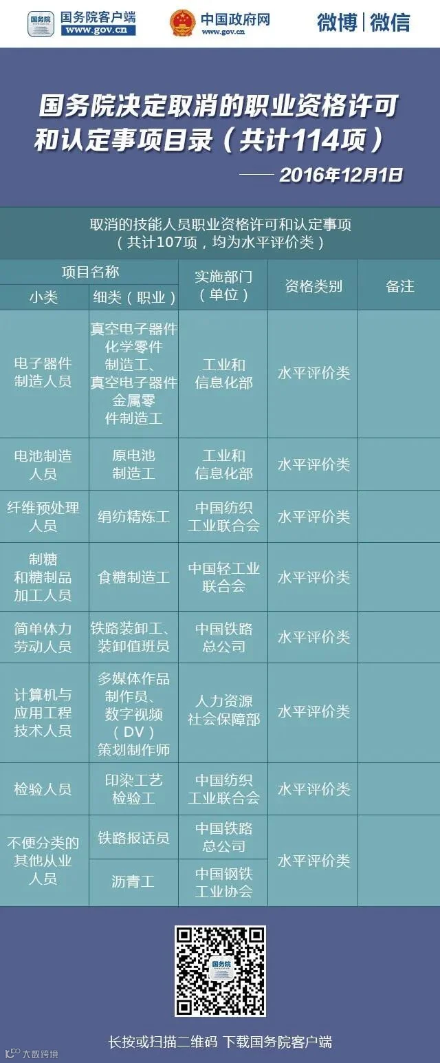 第七批取消的职业资格许可和认定事项目录(共计114项)
