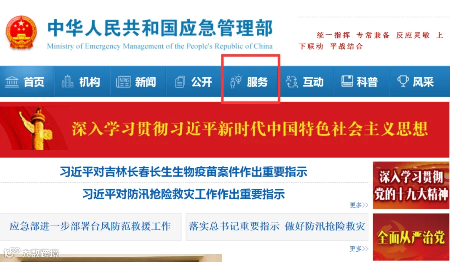 1、浏览器输入https://www.mem.gov.cn/登录“应急管理部”网站查询;点击“服务”进入;
