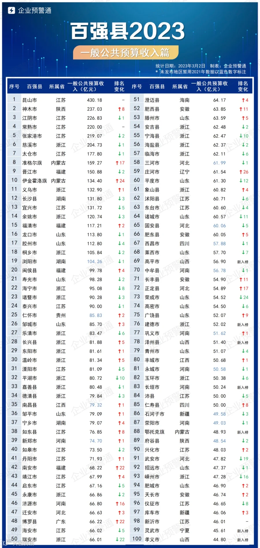 百强县(一般公共预算收入篇)
