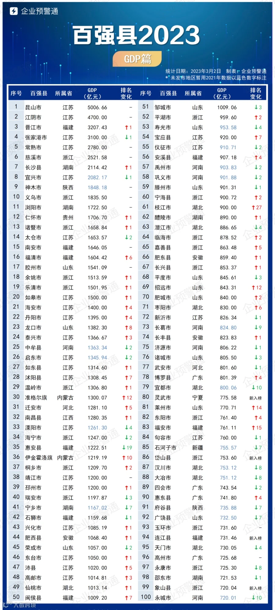 2023年百强县数据详情如下,企业预警通将在下个月1号再次更新百强县最新披露情况,持续跟踪国内经济数据。