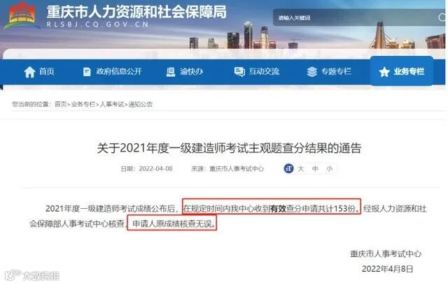 近期,湖南、重庆两地人事考试中心发布22年一建补考成绩复核结果。经核查,成绩全部无误!公告原文如下: