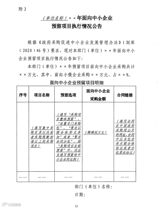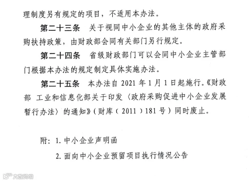 财政部、工业和信息化部于2020年出台《政府采购促进中小企业发展管理办法》,2021年1月1日起施行。对适宜由中小企业提供的,预留采购份额专门面向中小企业采购: