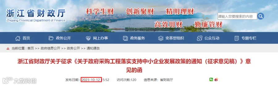 昨日,浙江省财政厅发布关于征求《关于政府采购工程落实支持中小企业发展政策的通知(征求意见稿)》意见的函。本通知自2023年11月1日起执行。