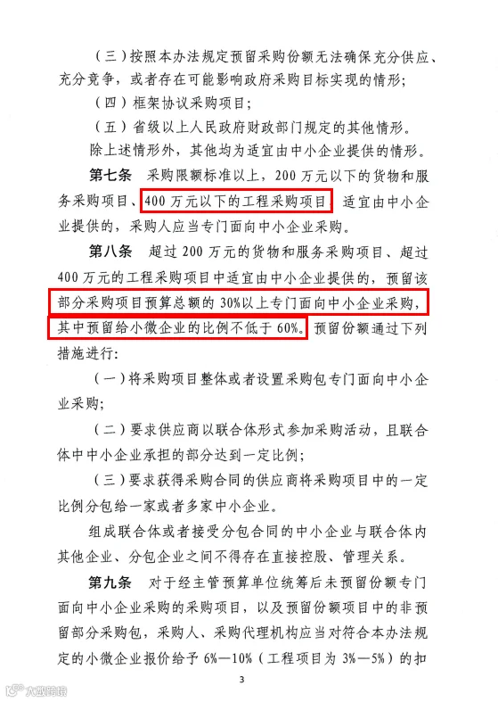 超过400万元的政府采购工程中适宜由中小企业提供的,预留该部分项目预算总额的40%以上专门面向中小企业采购。