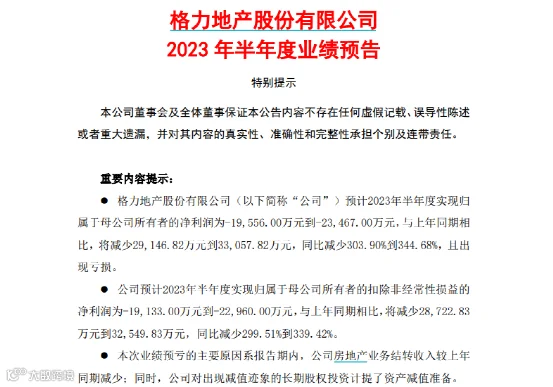 7月13日晚间,格力地产同时发布2023年半年度业绩预告,净利润大幅下滑。