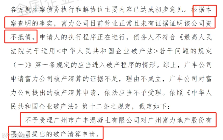 富力地产方面表示,广州富力目前的资产高于负债,不存在资不抵债的情况,且经营正常,不具备破产原因;与广丰混凝土、祥正商贸正在积极商谈和解中。