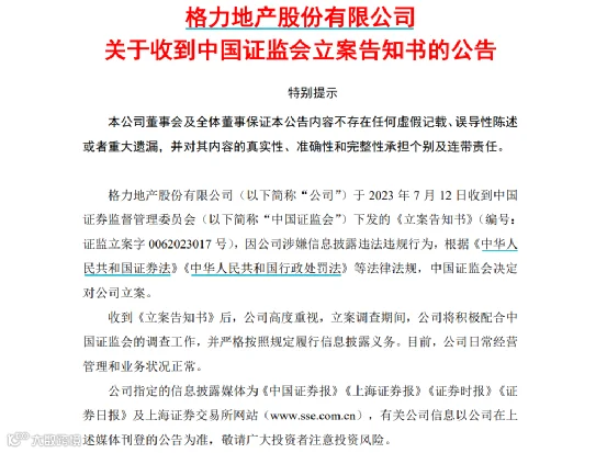 7月13日晚间,格力地产股份有限公司发布关于收到中国证监会立案告知书的公告。