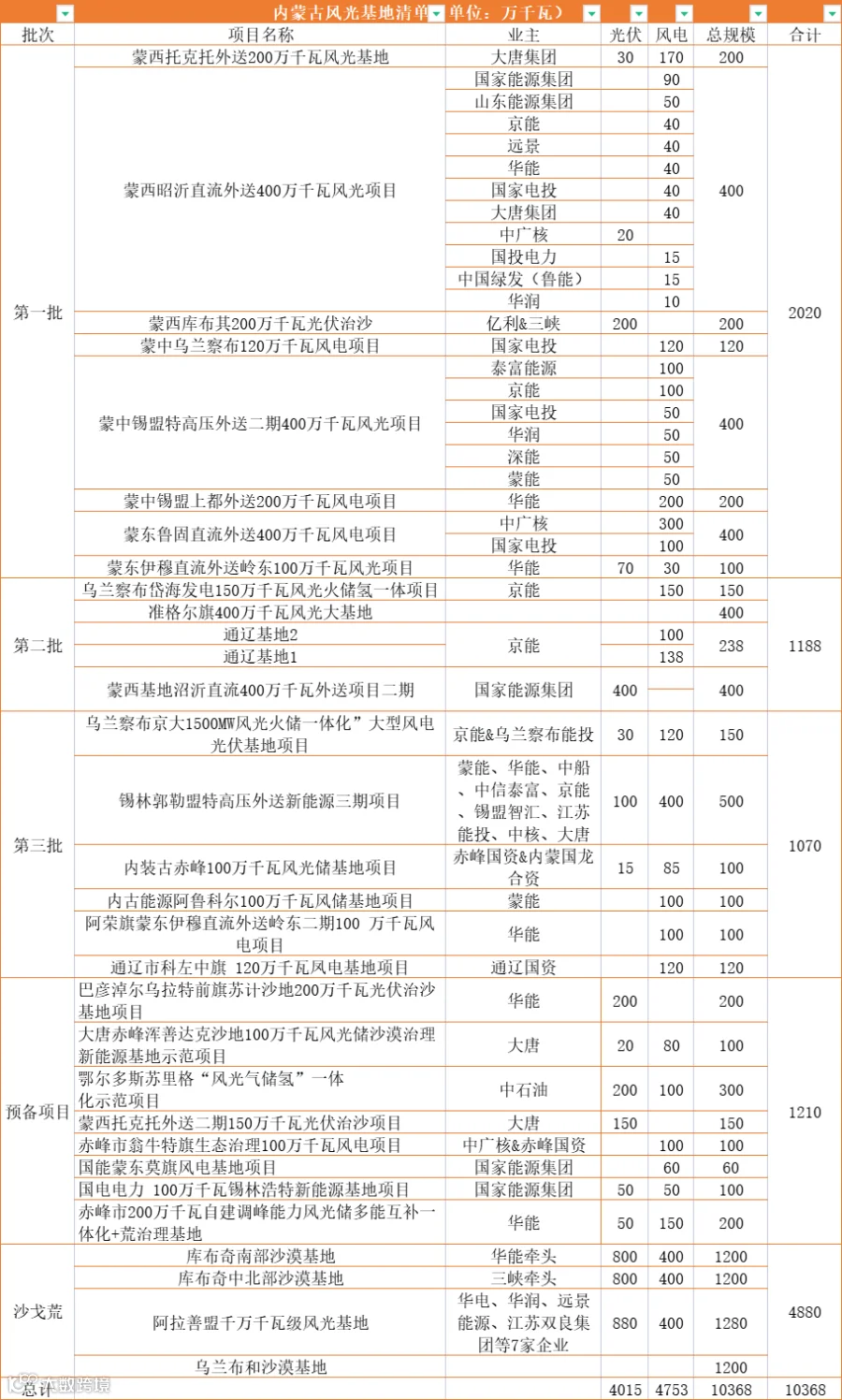 结合此前内蒙古印发、公开的第一、二批风光基地以及沙戈荒基地来看,截止到目前为止,内蒙古已批复超103GW的风光基地项目,公开可查的有87GW项目已经完成分配。