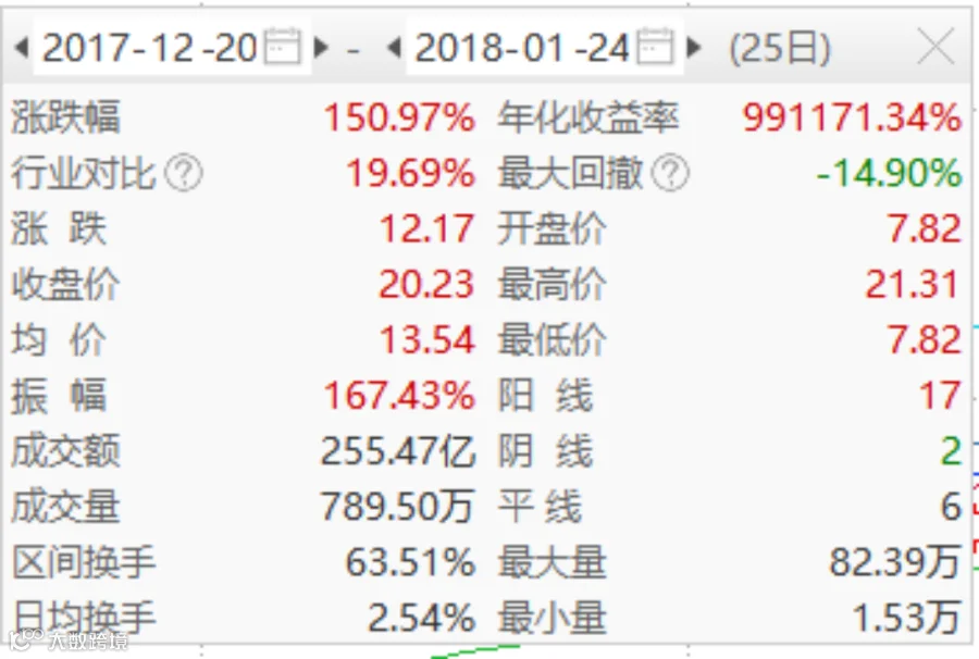 2017年12月20日至2018年1月24日,泰禾股价上涨超过150%。