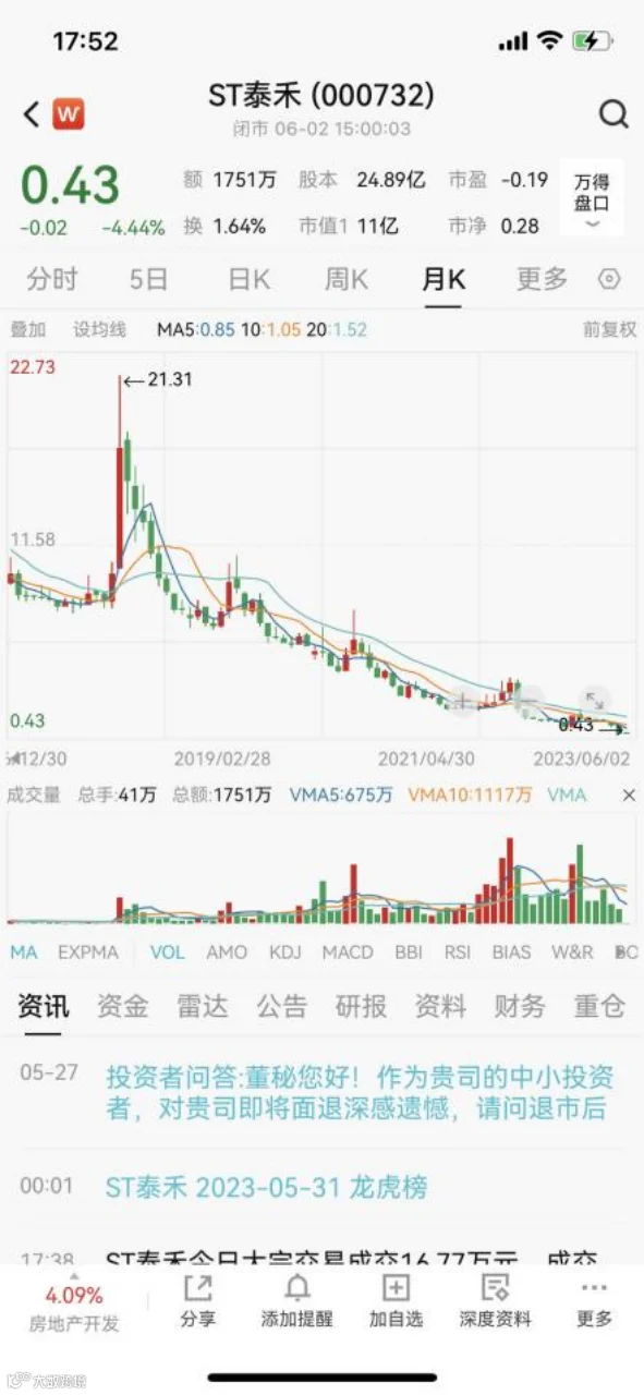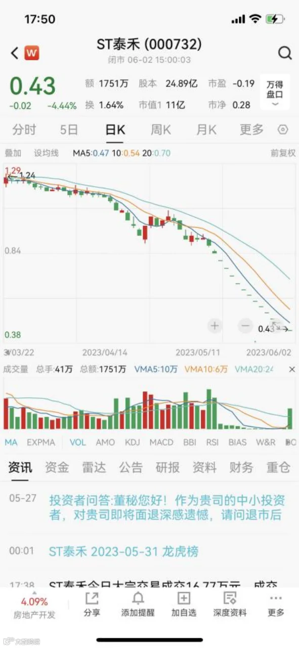 截至3月31日,ST泰禾仍有5.32万户股东。此后,公司股票交易冷清,在5月8日跌破面值后,一路下挫,5月16日至6月2日更是连续跌停。