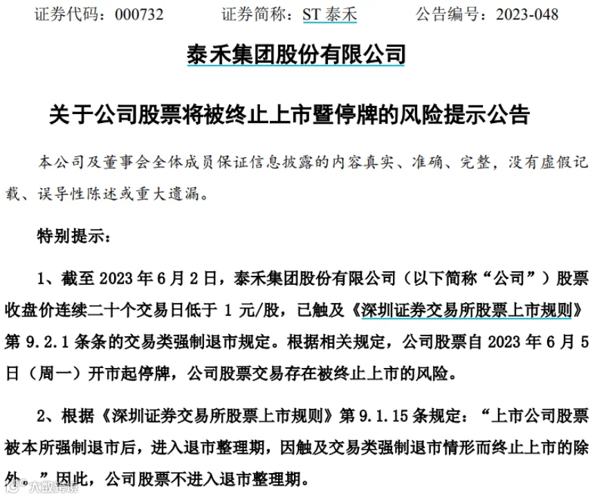 ST泰禾6月2日晚间发布公告称,截至当日,公司股票收盘价已连续20个交易日低于1元/股,触及交易类强制退市规定。