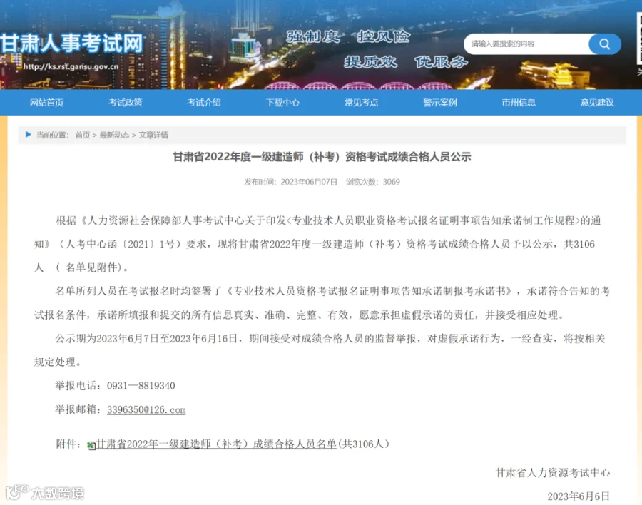 甘肃省2022年度一级建造师(补考)资格考试成绩合格人员公示,共3106人 。