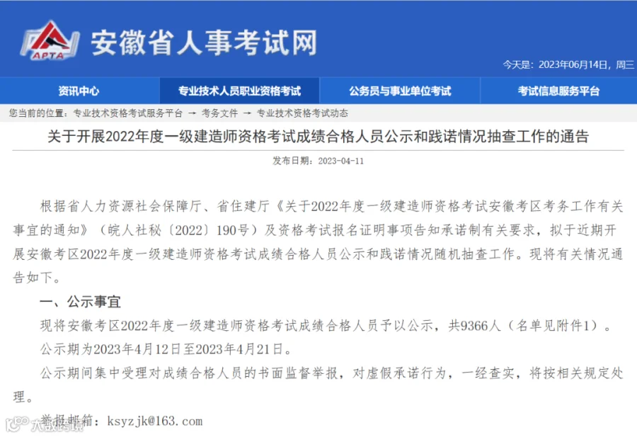 4月14日,吉林省人事考试网发布了《2022年度一级建造师资格考试成绩合格人员公示》,全省共2244人合格,公示期为2023年4月14日至4月27日。