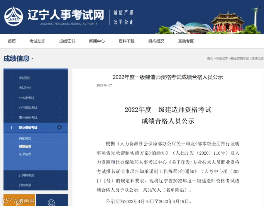 辽宁省2022年度一级建造师资格考试成绩合格人员公示,共3476人。