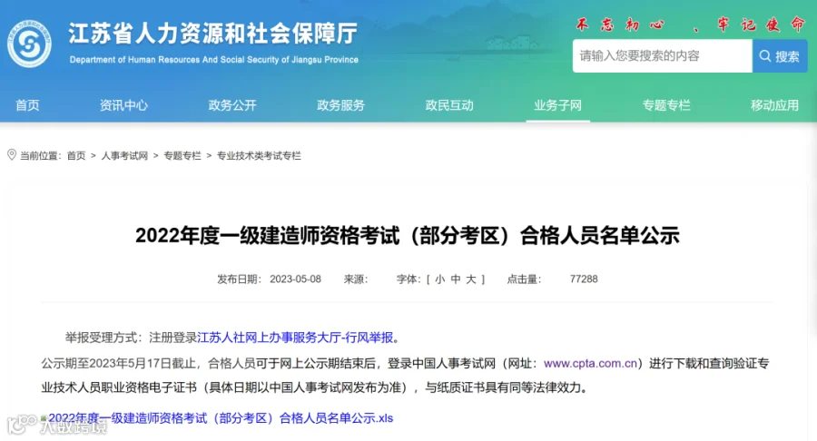 此前,江苏省人社厅发布《2022年度一级建造师资格考试(部分考区)合格人员名单公示》,名单显示共17576人拟合格。
