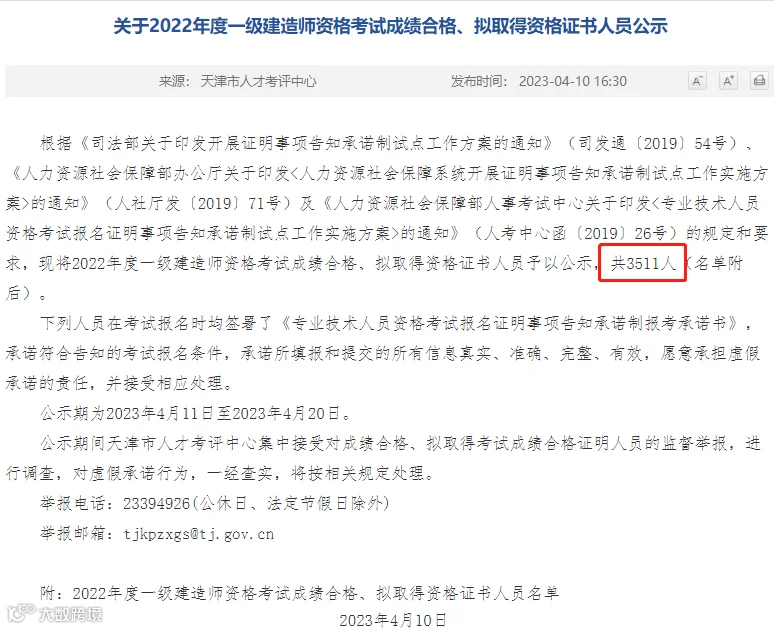天津考区2022年度一级建造师资格考试成绩合格人员公示,共3511人。