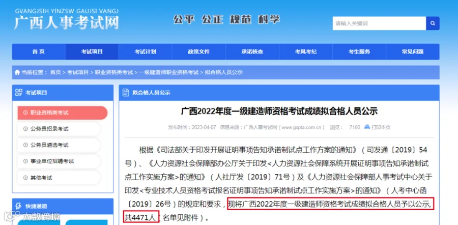 广西2022年度一级建造师资格考试成绩拟合格人员公示,共4471人。