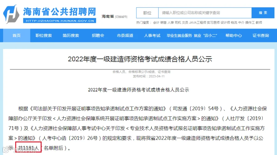 海南省2022年度一级建造师资格考试成绩合格人员公示,共1181人。