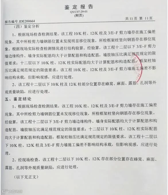 鉴定结论显示:根据现场检查检测结果,该工程10/K柱、12/K柱及3/E~F剪力墙存在施工偏差现象,其中所检剪力墙钢筋位置未发现明显移位现象,所检框架柱竖向钢筋存在移位现象。根据现场实际检查检测情况进行结构验算。经验算,该工程十二层以下3/E~F剪力墙边缘构件、墙身实际配筋均大于计算配筋和构造配筋,墙肢轴压比满足规范规定的限值要求;十二层以下10/K柱、12/K柱实际配筋均大于计算配筋和构造配筋,框架柱轴压比满足规范规定的限值要求。该工程10/K柱、12/K柱及3/E~F剪力墙存在施工偏差不影响结构承载,但影响观感,应进行处理。