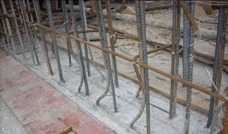 3、根据弹好的外皮尺寸线,检查下层预留搭接钢筋的位置、数量、长度,如不符合要求时,应进行处理。绑扎前先整理调直下层伸出的搭接筋。