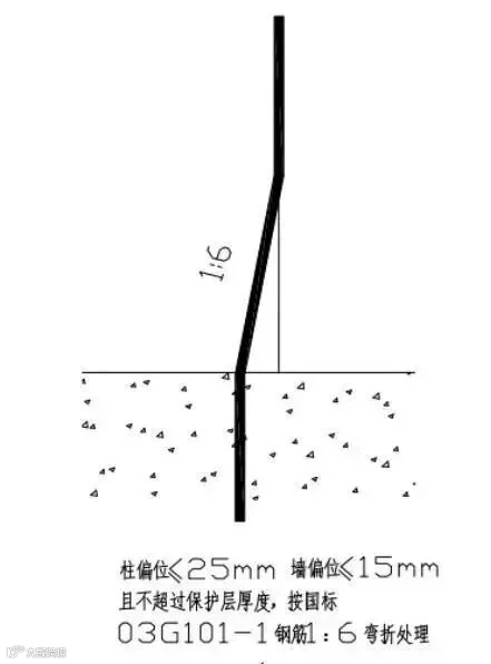 如果钢筋位移在 25mm 到 50mm 之间且向内偏,可直接在楼面上按 1:6 比例调整钢筋,保证模板支设,同时采取钢筋根部绑扎和点焊钢筋的方法进行加固,加筋的直径为 14,加筋需要与打弯的钢筋绑扎搭接在一起。