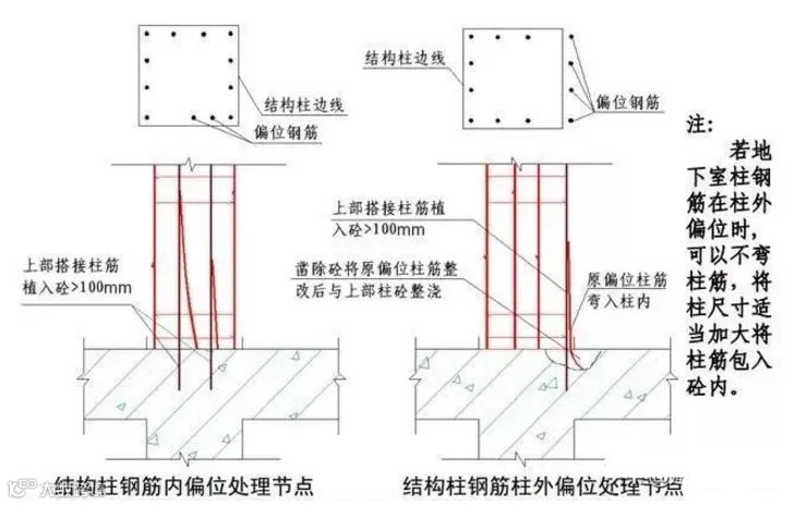 如果钢筋偏位(柱>25mm;墙>15mm) ,向外偏超过保护层厚度,结构截面不能局部加大处理时可将偏位钢筋打弯锚固,割除长出部分原钢筋,再另植相同钢筋的方法处理。