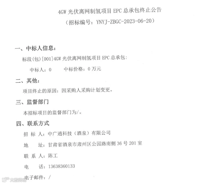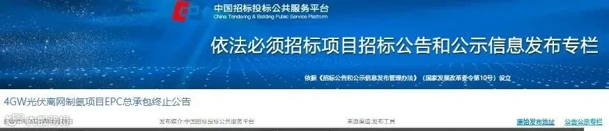 仅仅6天(6月26日),中国招标投标公共服务平台又发布了《4GW光伏离网制氢项目EPC总承包终止公告》。公告显示项目终止的原因是“因采购人采购计划变更”。
