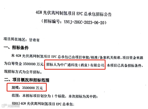 6月23日,肃州区发现中广通酒泉在“中国招投标公共服务平台”发布了《4GW光伏离网制氢项目EPC总承包招标公告》,市区两级政府高度重视,迅速核实该项目招投标程序。