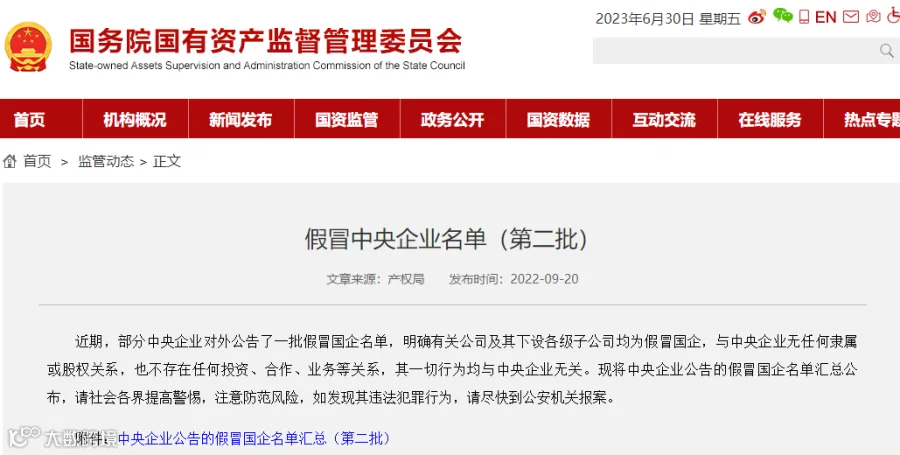 2022年9月,国务院国资委网站发布了第二批假冒中央企业名单。涉及企业528家。