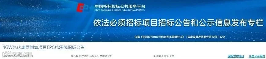 6月21日,中国招标投标公共服务平台发布了《4GW光伏离网制氢项目EPC总承包招标公告》,招标人为中广通科技(酒泉)有限公司,项目资金为350亿元。