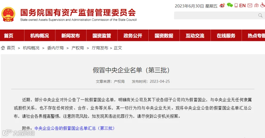 2023年4月26日,国务院国资委公示了第三批假冒中央企业名单。据了解,本次集中公示的假央企数量近300家。