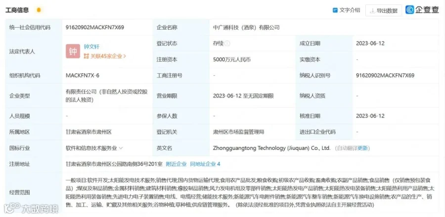 6月6日至14日,中广通科技(云南)有限公司(中广通酒泉母公司)到肃州区考察,提出在肃州区建设4GW光伏离网制氢项目,6月7日与肃州区政府签订了意向性投资合作框架协议。6月13日,应企业要求,肃州区发改局为其办理了项目备案手续。
