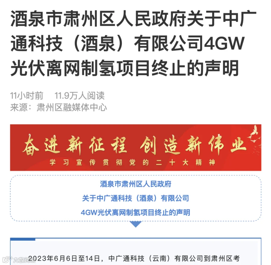 甘肃酒泉市肃州区政府在其融媒体中心发布声明,终止中广通科技(酒泉)有限公司4GW光伏离网制氢项目。