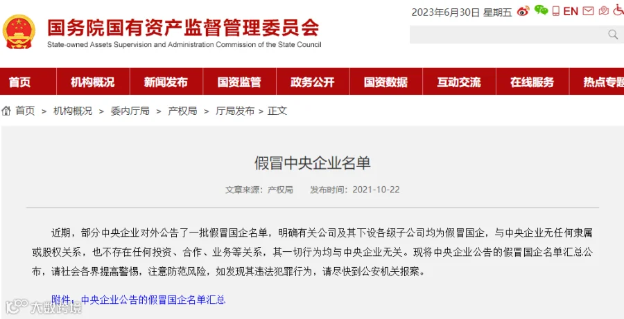 2021年10月,26家中央企业通过官网、微信公众号等多种渠道对外公告了353家假冒国企名单。