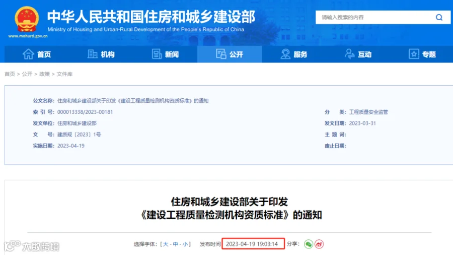 去年年底,住建部出台《建设工程质量检测管理办法》中华人民共和国住房和城乡建设部令第57号,自2023年3月1日起施行。