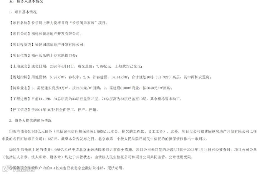 ①现有债务5.365亿元债务(包括民生信托担保债务4.965亿元本金、拖欠的工程款、员工工资)。此外,项目母公司福建闽越房地产开发有限公司以往来款的名目汇给项目公司11.5亿元。截至本公告发布之日,北京市第二中级人民法院已就民生信托的的担保债权作出一审判决。