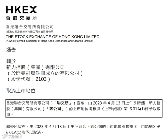 2023年4月13日,新力控股在停牌18个月之后,梦断港交所。