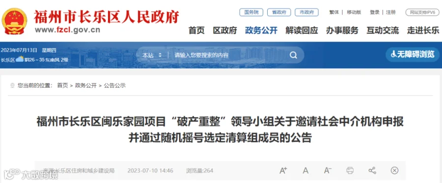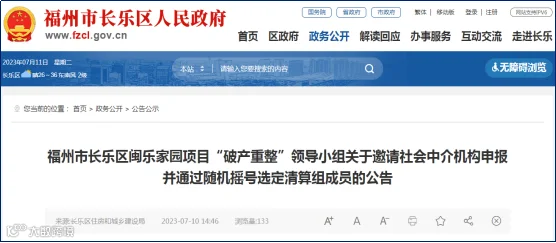 据福州市长乐区住房和城乡建设局公告,长乐区闽乐家园项目“破产重整”领导小组邀请社会中介机构申报并通过随机摇号选定清算组成员。