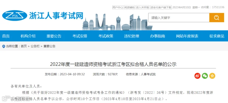 2022年度一级建造师考试浙江考区拟合格人员公示,共计10409人。
